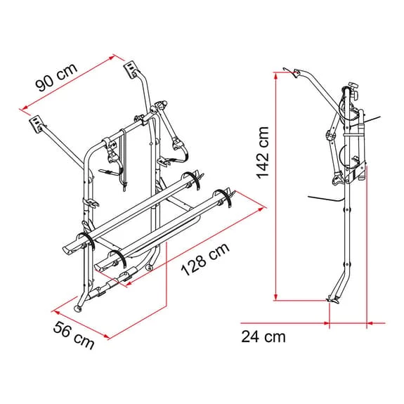 The Fiamma Volkswagen T5 bicycle rack for 2/4 bicycles is part of the range of bicycle carriers for all VW minivan models. From the Volkswagen Caddy to the T2. It includes a practical bike rack tensioning system and allows you to open the rear door with the bike rack installed without bicycles. As standard, up to 2 bikes can be loaded, if an extension is used, up to 4 bikes can be loaded.